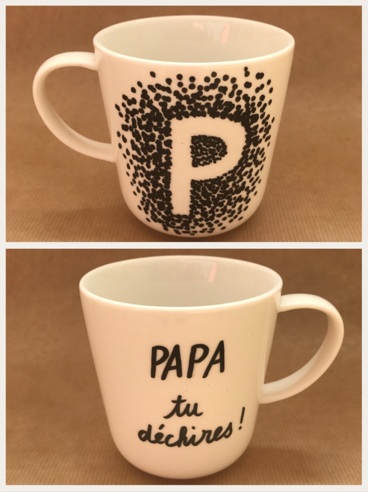 Comme certains papas ne sont pas toujours là, il n’est pas forcément évident de leur faire passer de gentils petits messages ou de belles attentions. Mais par contre comme presque tous les papas prennent un café, un thé ou un chocolat chaque matin, Berthe nous suggère, cette semaine, de leur écrire un petit mot gentil sur un mug et de le leur offrir pour la fête des pères. Ça vous dit ?